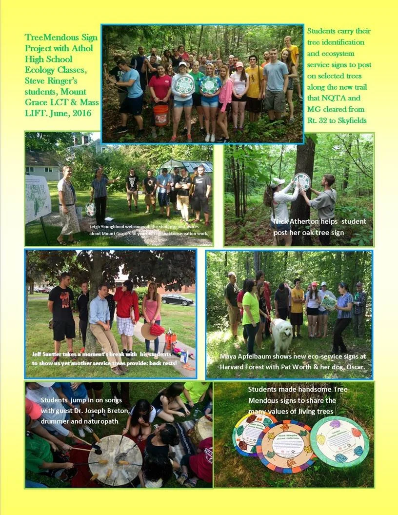Another terrific project I developed collaboratively is called Treemendous. This workshop series involved high school and university students in learning about important ecosystem services such as trees’ carbon sequestration, its provision of food and habitat for various animal species and its shade-giving gifts. Then they made beautiful hand-made signs to share their growing knowledge of the trees with the public. The signs tare mounted on forest trails and in school yards.