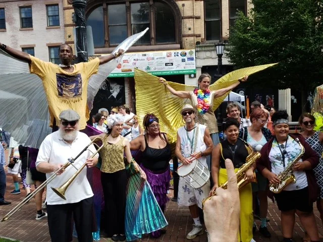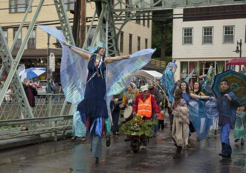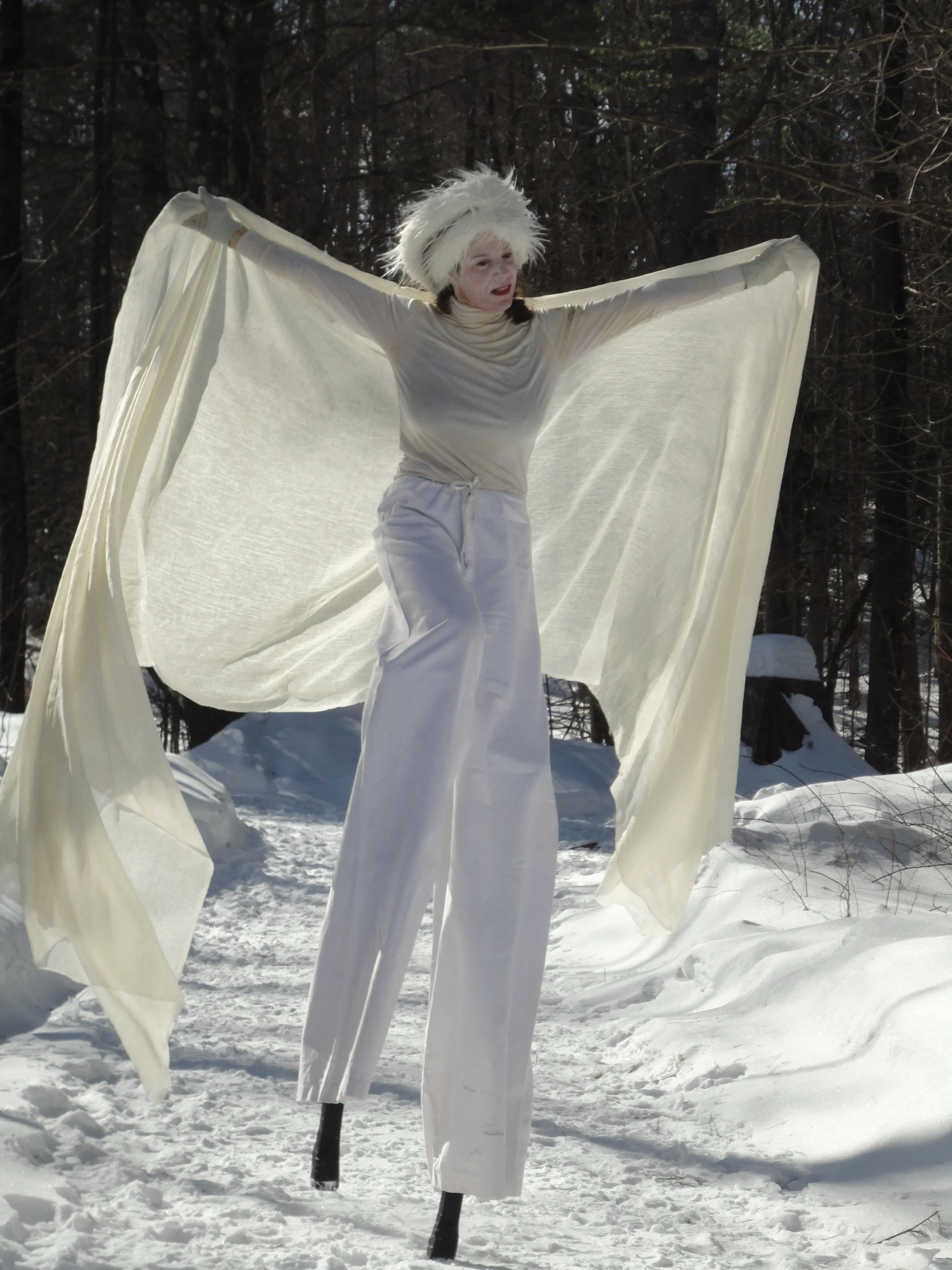Serendipity Stilt Dancers also performs in special costumes and roles that convey natural features such as rivers, fish, trees and snow. We do this at rallies, parades, festivals and benefit fundraisers. One of my favorite events was representing a tree as I danced on my tall wood stilts to Jim Scott’s music for a benefit I also helped plan to raise funds to save a Silver Maple Forest from development. This work has been a humbling exquisite honor.